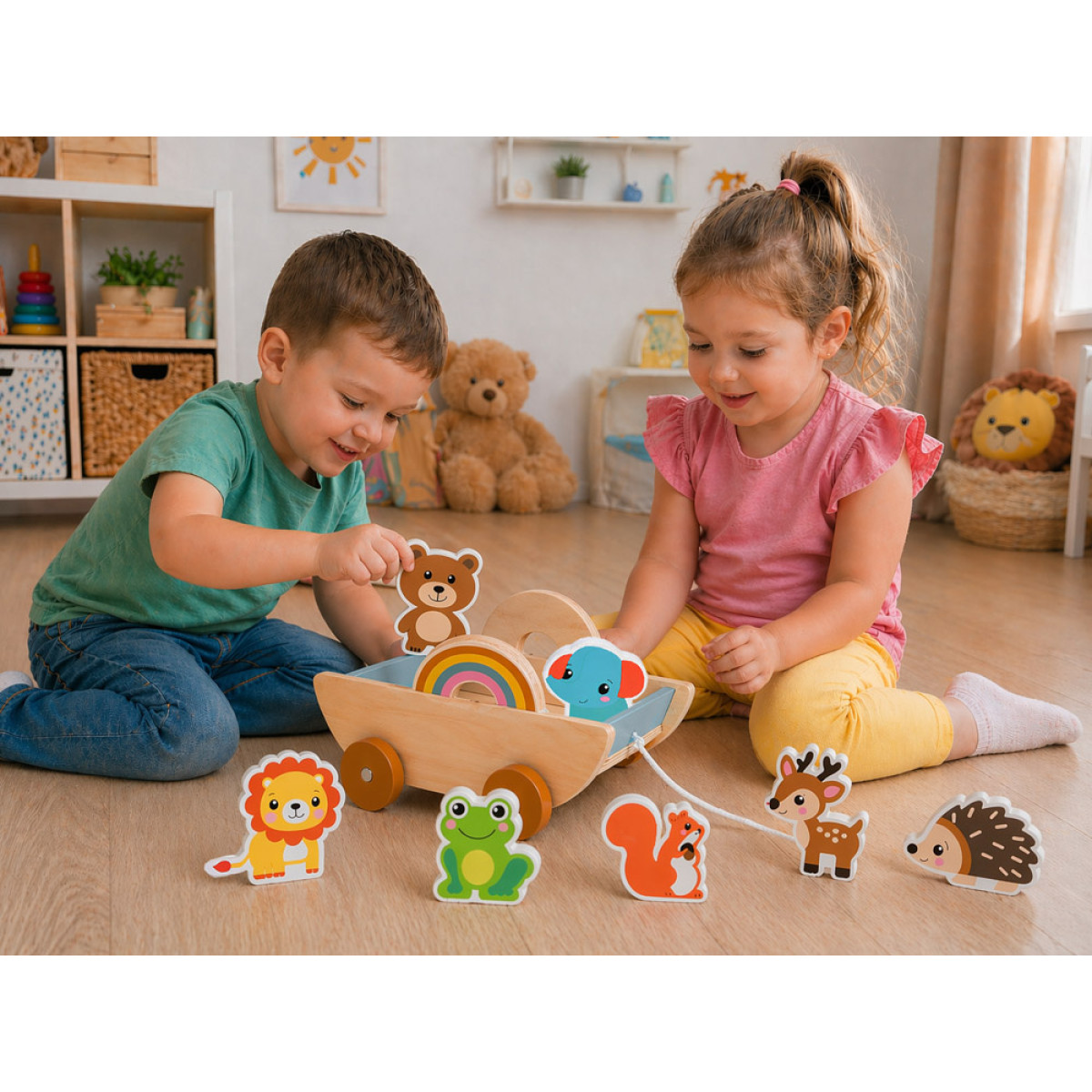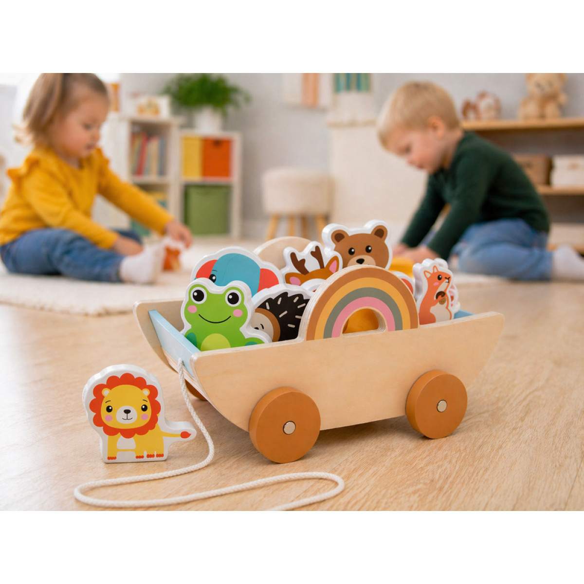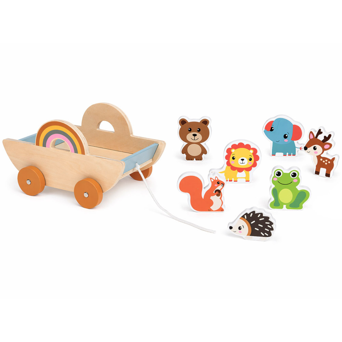 medinis vežimėlis su gyvūnais – smagus ir lavinantis žaislas vaikui. Šis žaislas sujungia kelias mėgstamas veiklas: vežimėlio traukimą, gyvūnų vežiojimą ir atskirą žaidimą figūrėlėmis. Vaikas gali kurti savo istorijas, nuotykius ir žaidimo scenarijus, todėl žaislas ilgai išlieka įdomus.