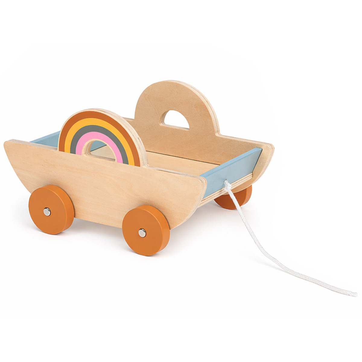 vežimėlis pagamintas iš kokybiškos šviesios medienos, o ratukai, rankenos ir priekinė dalis dekoruoti švelniomis pastelinėmis spalvomis. Priekyje yra skylutė su virvele, todėl žaislą galima lengvai traukti. Jei virvelė pasirodytų per trumpa, ją galima pakeisti kita. Patogios rankenos padeda vaikui lengvai nešti vežimėlį, o jų forma pritaikyta mažoms rankytėms.