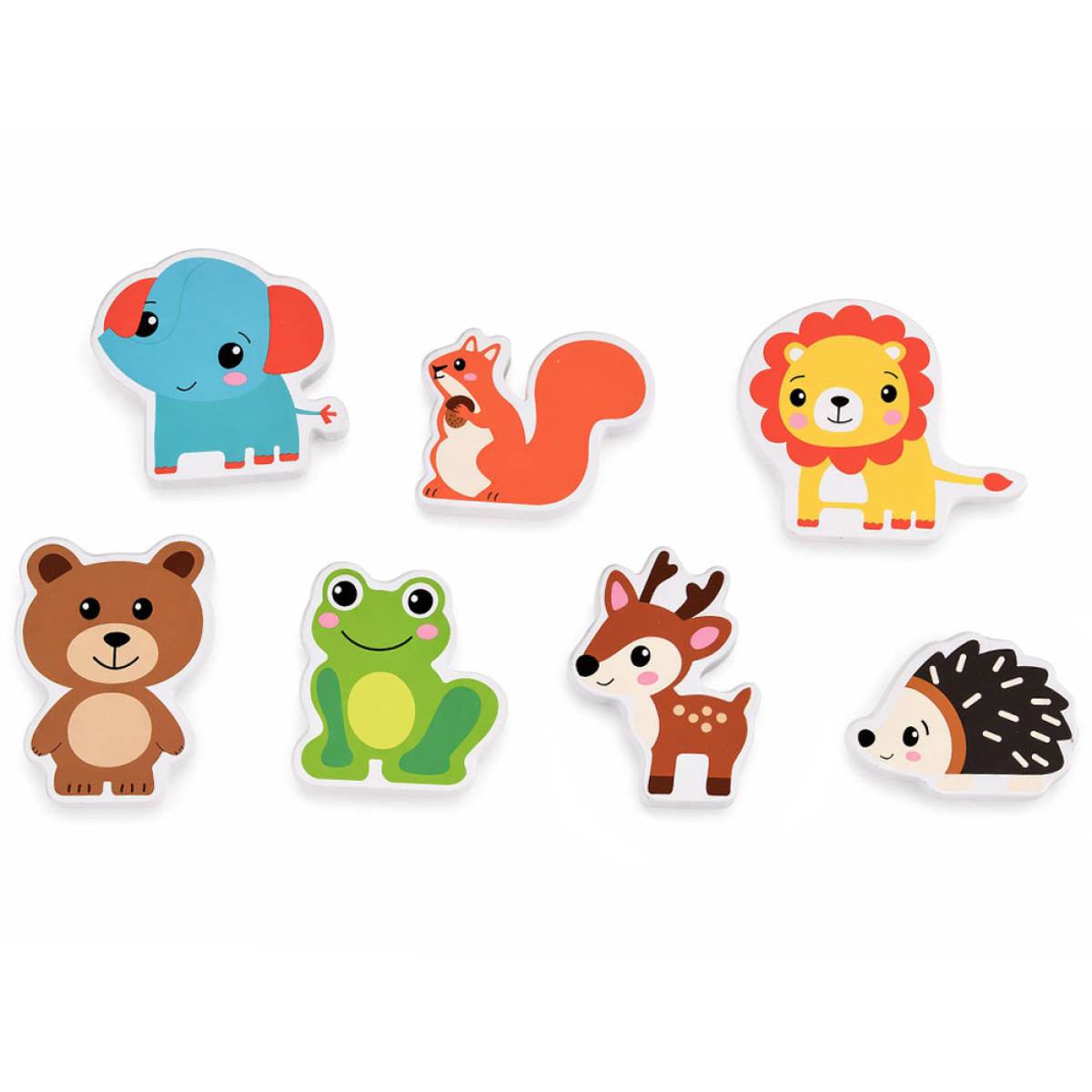 rinkinyje yra 7 mediniai gyvūnai, pagaminti iš kokybiškos medienos. Kiekvienas gyvūnas išsiskiria miela išvaizda, spalvomis ir forma, primenančia tikrus gyvūnus. Visos figūrėlės turi draugiškas šypsenas ir aiškiai matomas akytes.