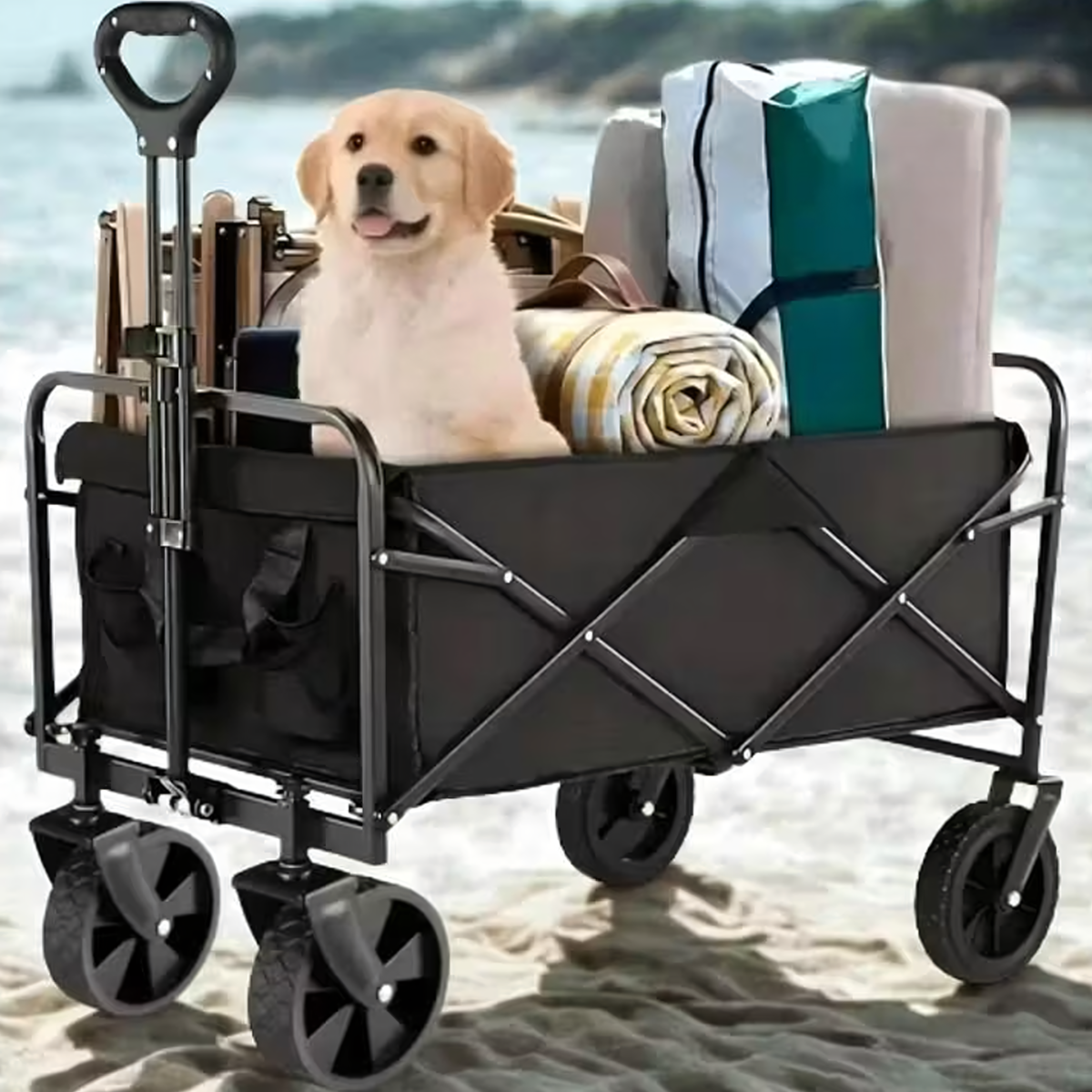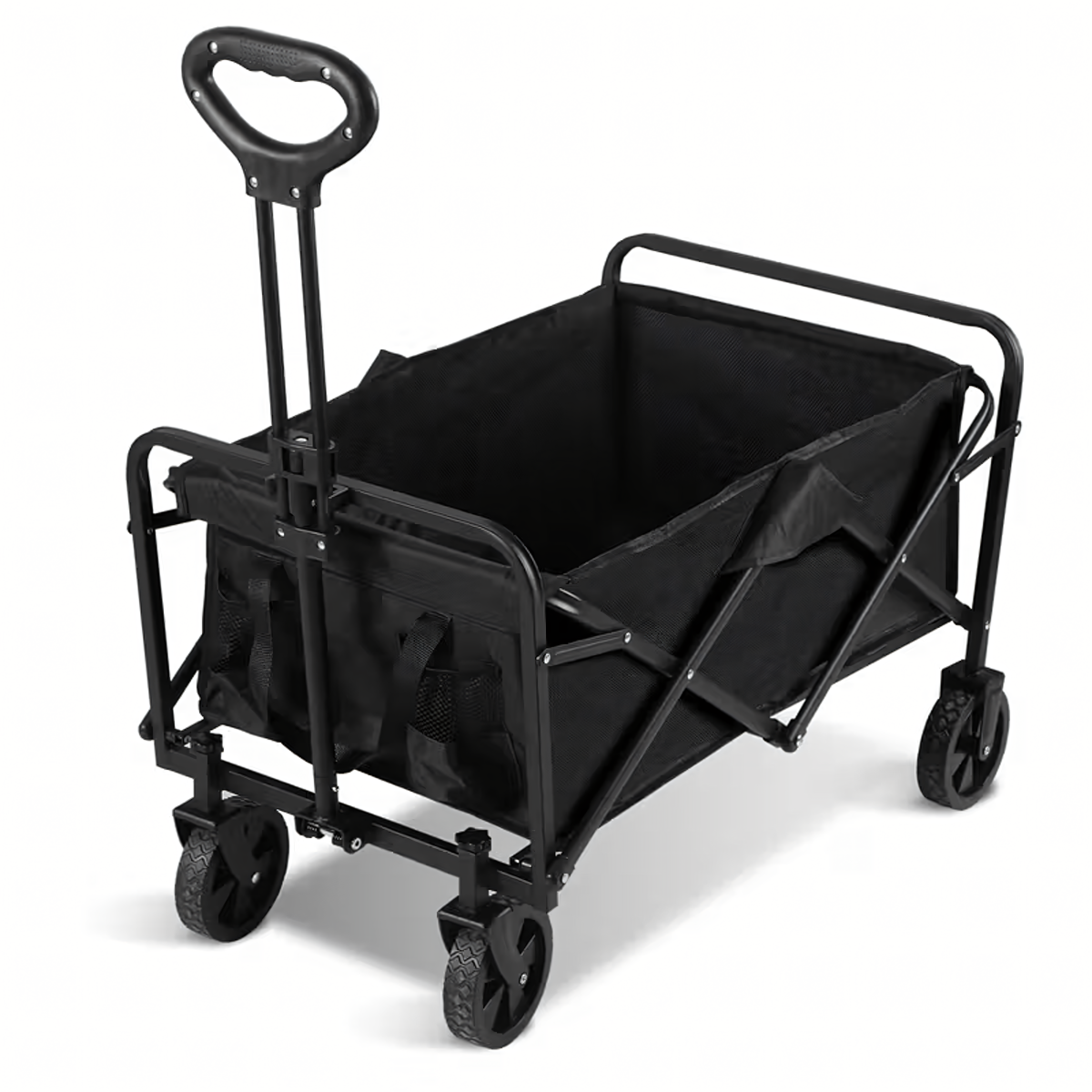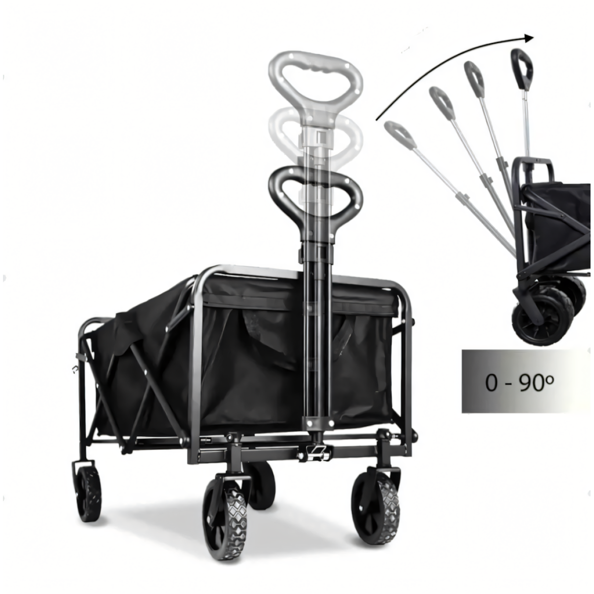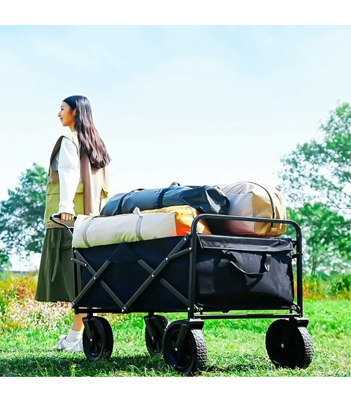 Sulankstomas turistinis vežimėlis yra puikus pasirinkimas paplūdimiui, sodybai, stovyklavimui ar apsipirkimui. Jis turi tvirtą plieninį rėmą, atsparų vandeniui audinį ir 360° besisukančius ratus. Sulankstytas užima mažai vietos ir yra lengvai transportuojamas.