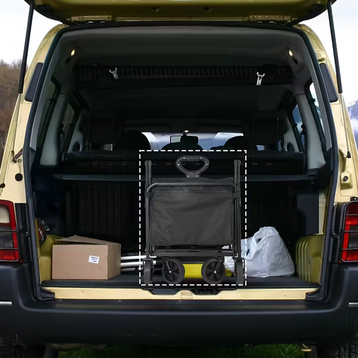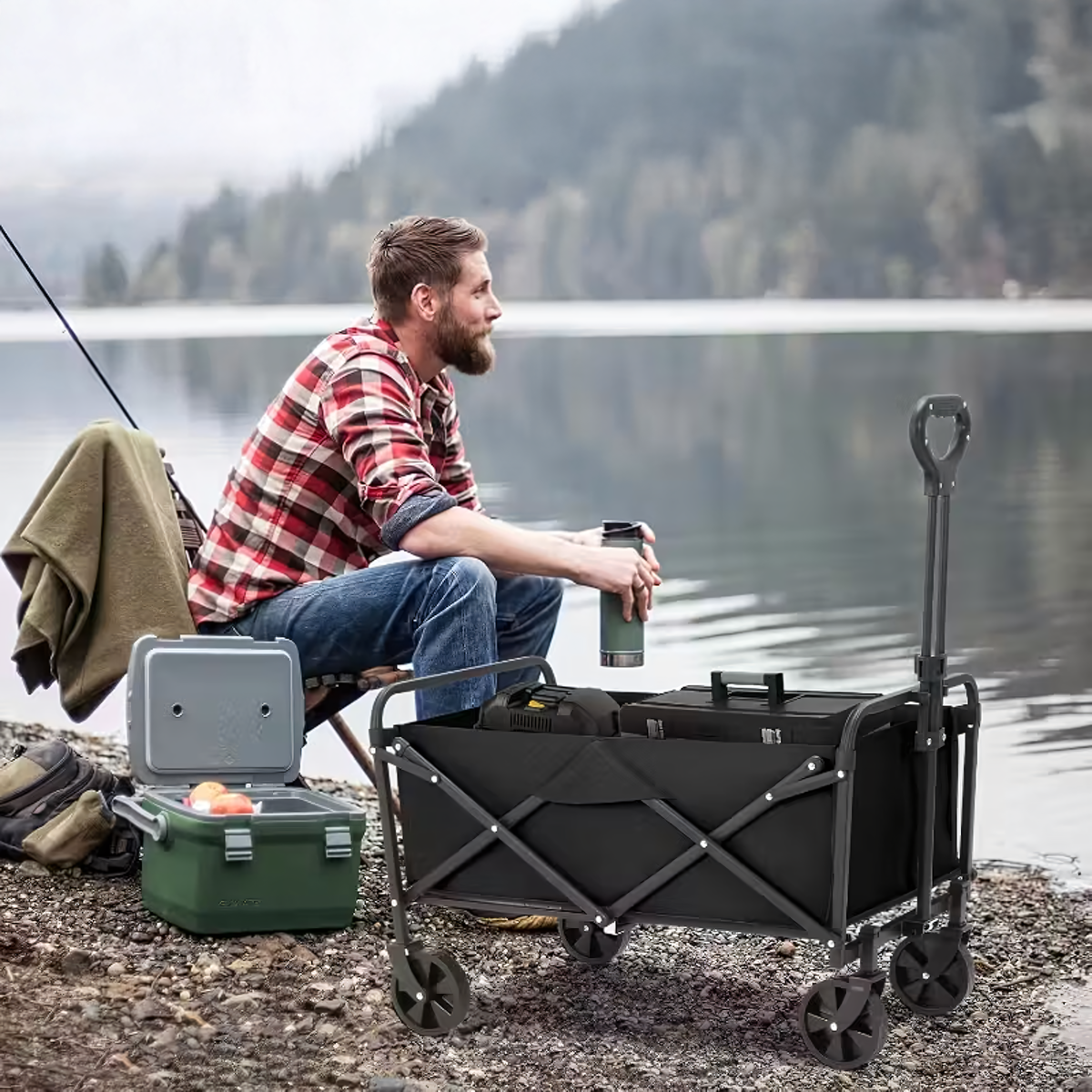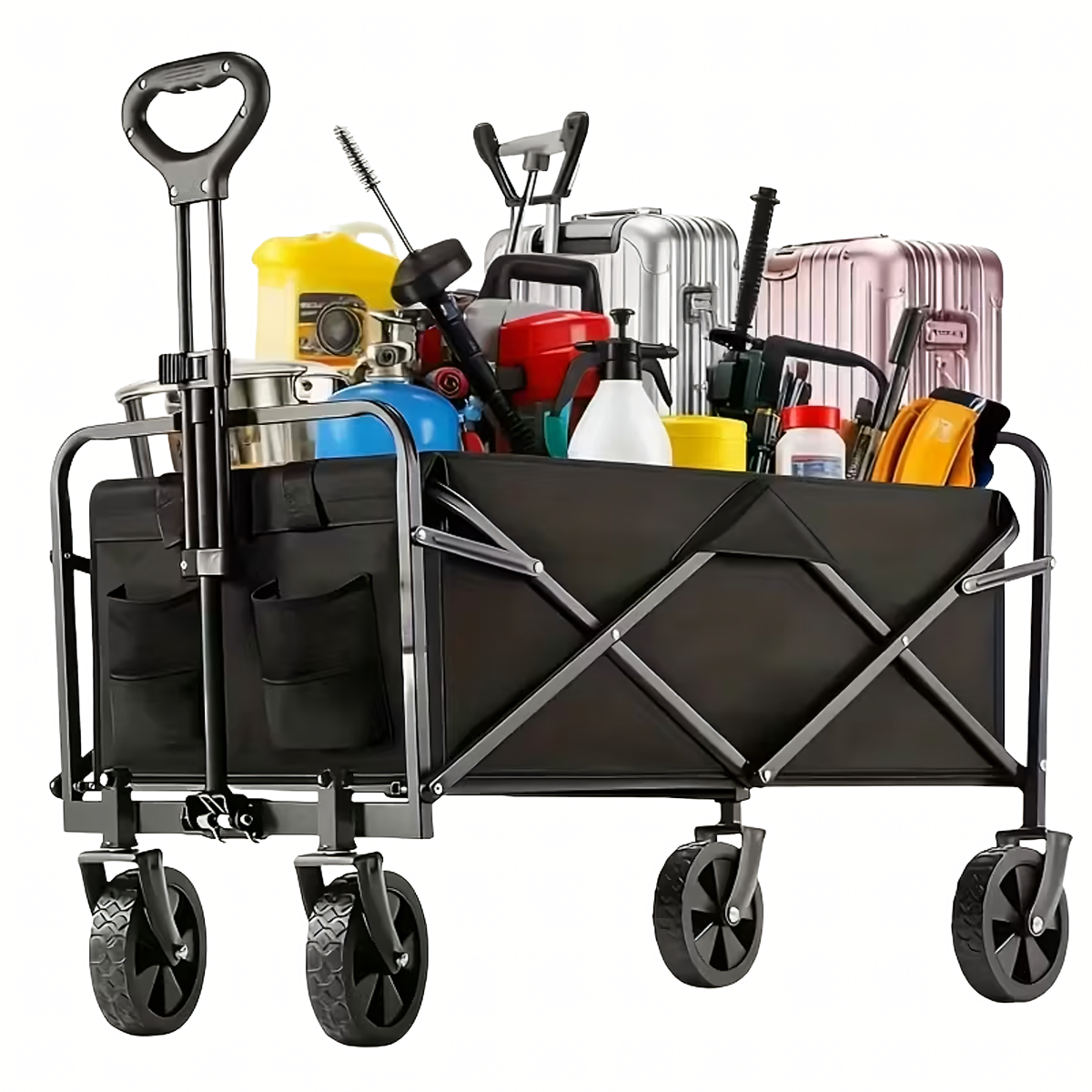Sulankstomas turistinis vežimėlis yra puikus pasirinkimas paplūdimiui, sodybai, stovyklavimui ar apsipirkimui. Jis turi tvirtą plieninį rėmą, atsparų vandeniui audinį ir 360° besisukančius ratus. Sulankstytas užima mažai vietos ir yra lengvai transportuojamas.