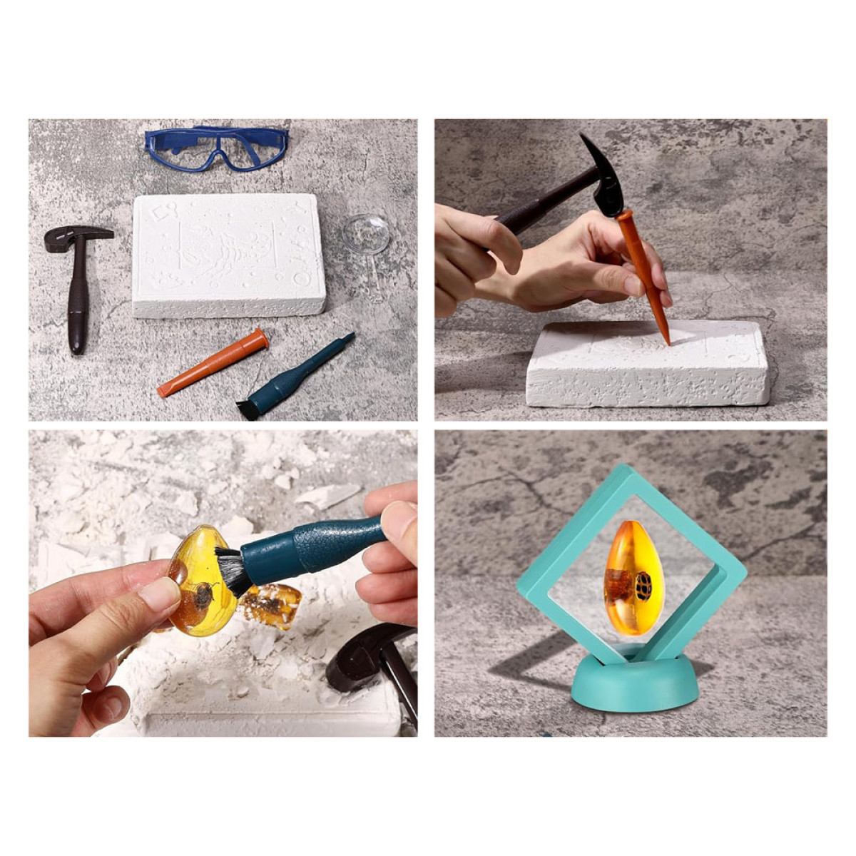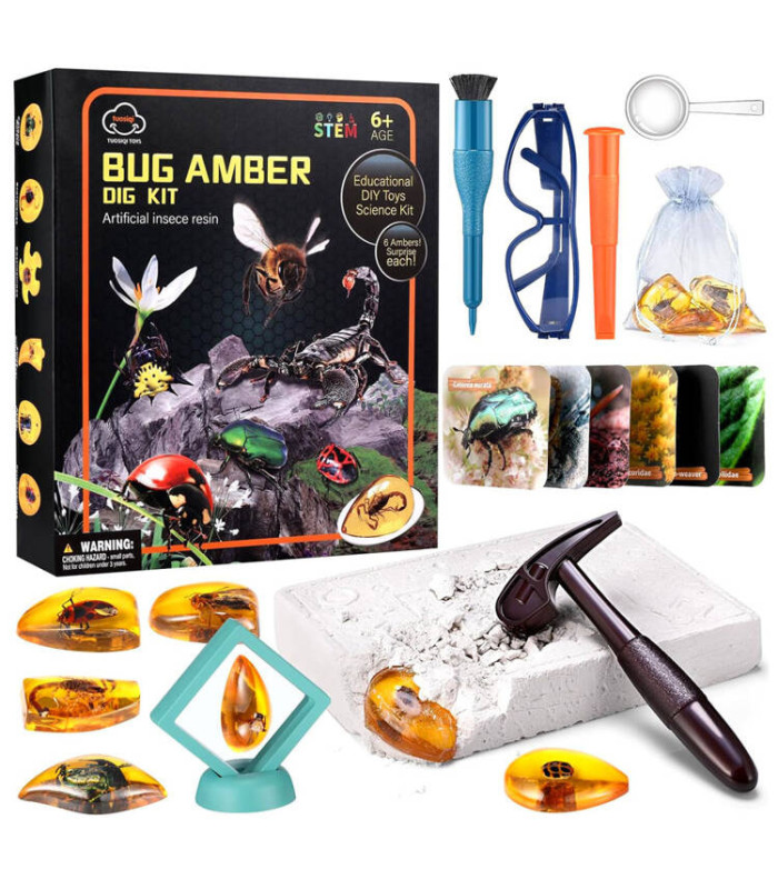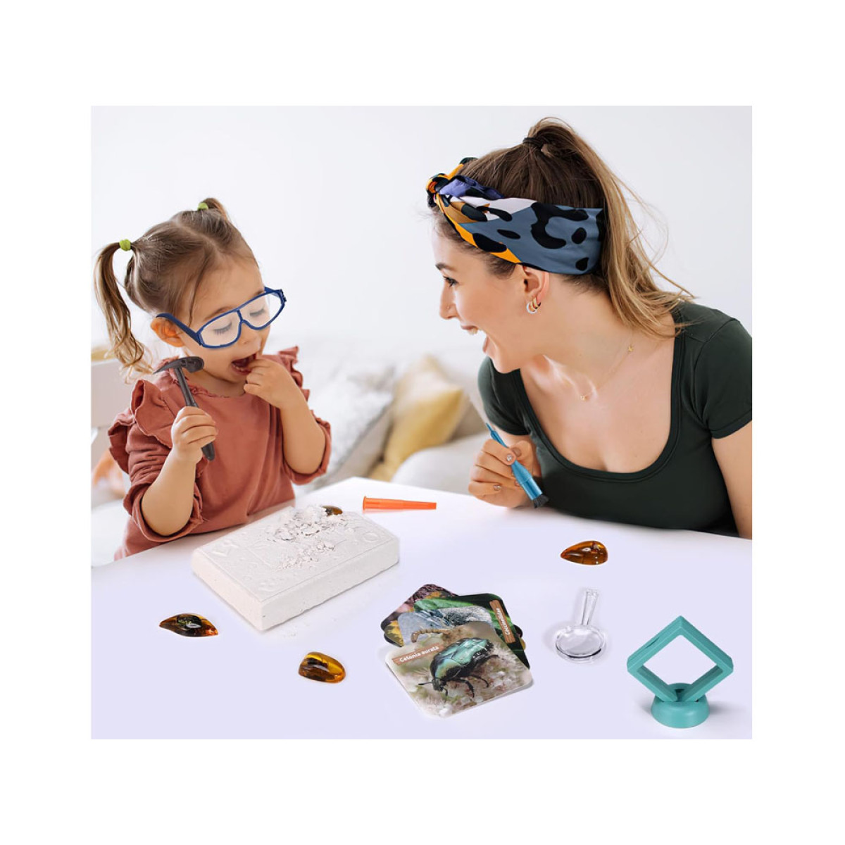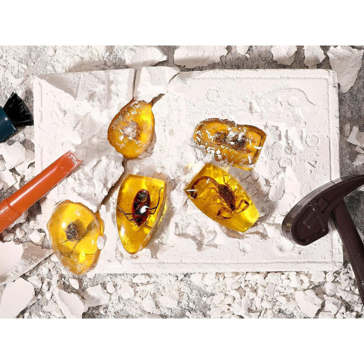 Gipso liejinyje paslėpti šeši gintarai su įstrigusiomis vabzdžiais. Naudojantis pridedamais įrankiais - plaktuku ir kaltu - reikia juos iškasti. Tai lėtas, bet labai malonus darbas. Surastus gintarus galima dėti į dekoratyvinį maišelį arba stendą, kad jie būtų įdomi kiekvieno vaiko kambario puošmena.Gipso liejinio matmenys: