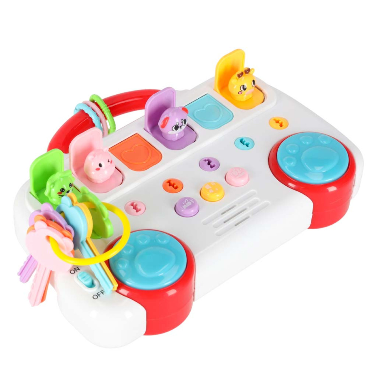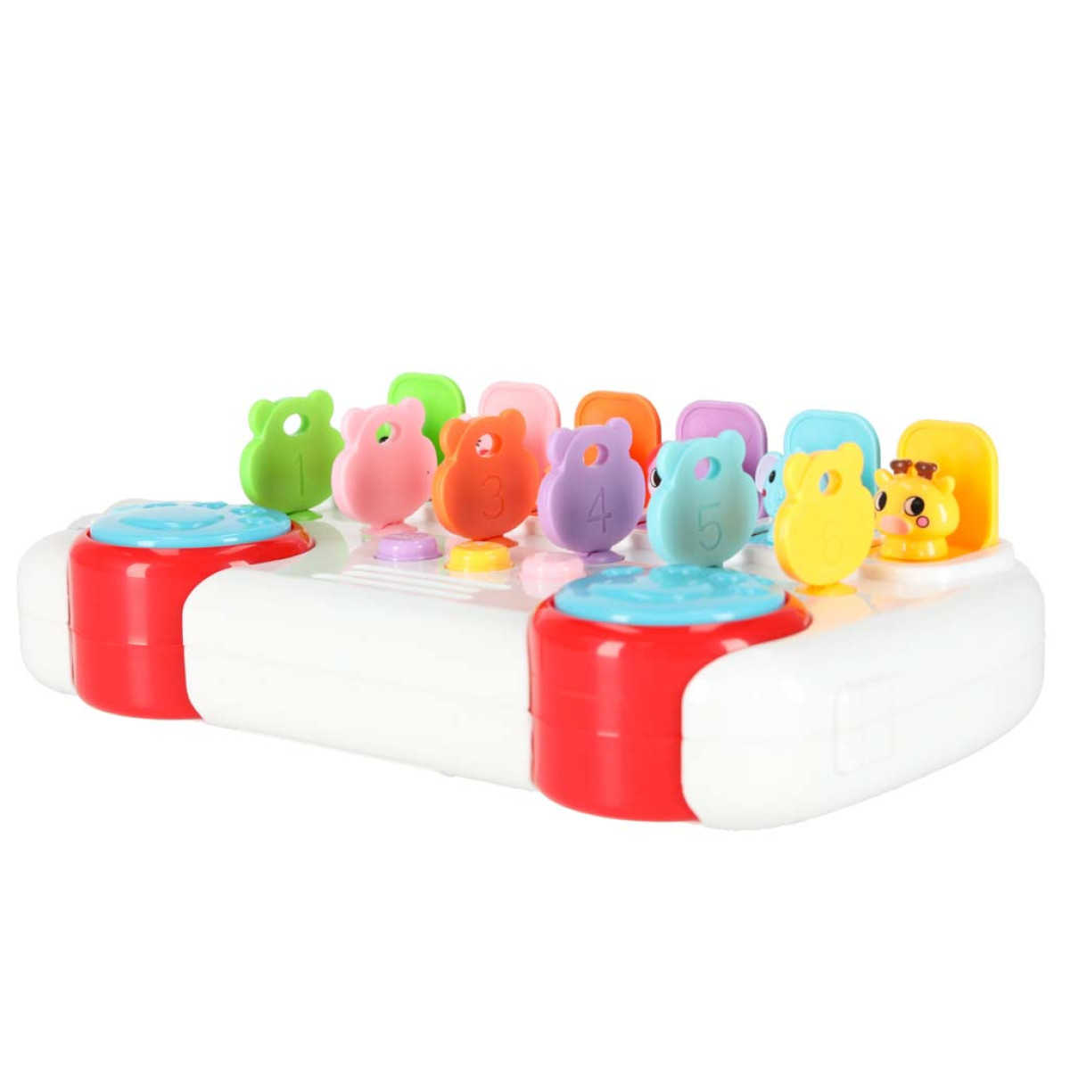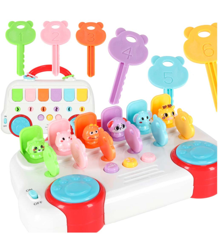 Garsinė vaikų žaisliukas – autobusiukas su rakteliais – turi šešis gyvūnėlius, slepiančius po dangčiais. Komplekte yra rakteliai, suderinti pagal spalvą ir formą su spynomis; sukant juos, gyvūnėlis iššoks. Kiekvienam gyvūnėliui priskirtas skaičius. Kai gyvūnėlis pasirodo, jis ištaria skaičių anglų kalba ir groja trumpą melodiją.