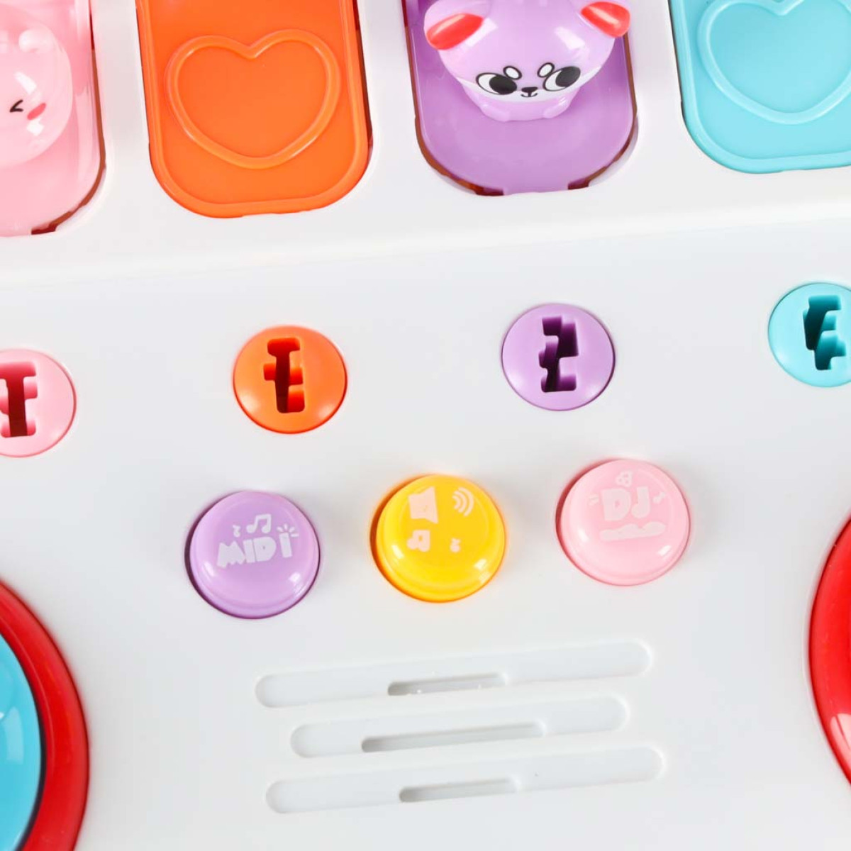 - Rožinis DJ mygtukas – groja 3 melodijas.