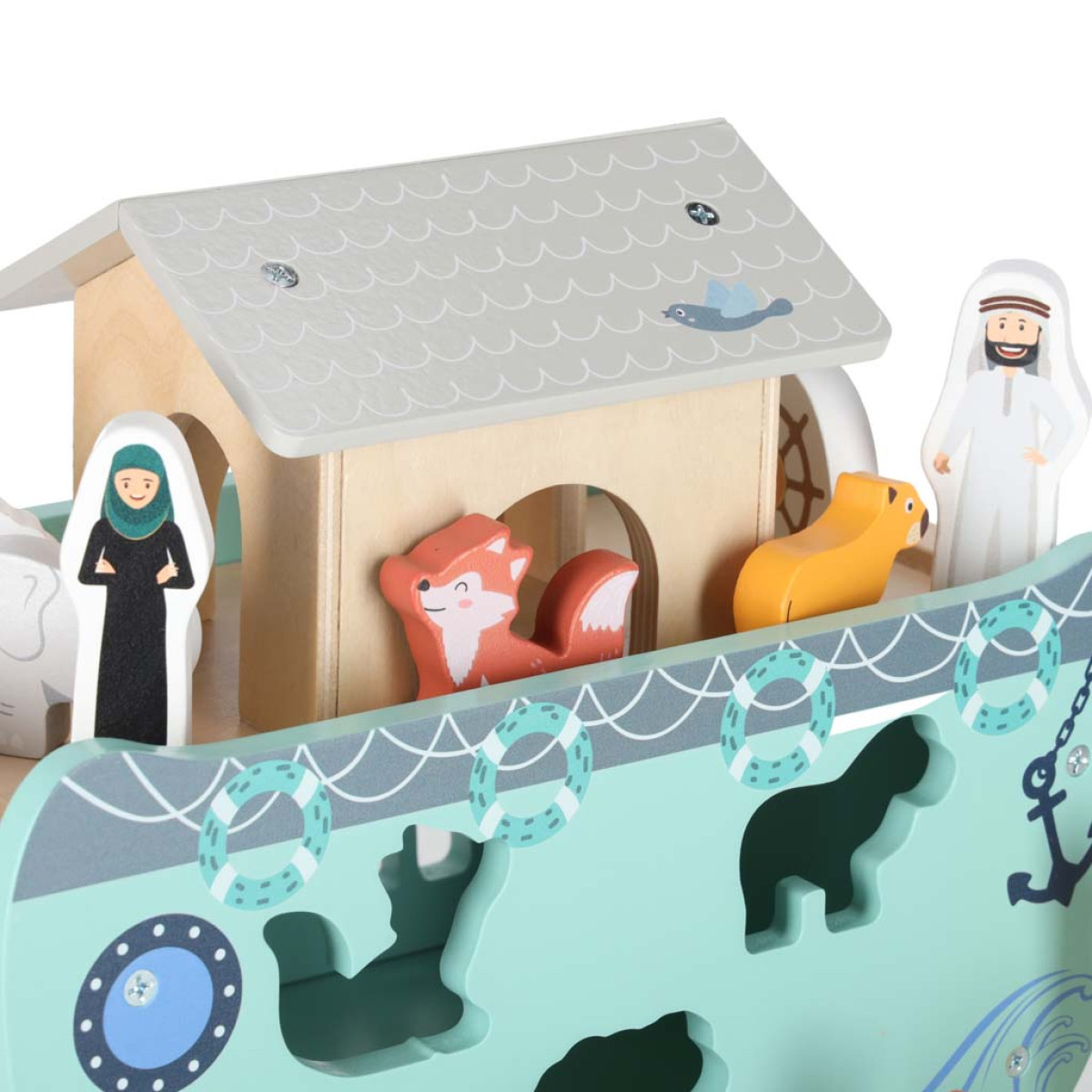Rinkinyje laukia medinės kruopščiai pagamintos gyvūnų figūrėlės (zebros, žirafos, drambliai, avys, liūtai, lapės), kurios supažindina vaikus su laikui nepavaldžia istorija. Be to, šalia yra Nojaus ir jo žmonos figūrėlės. Dėl jų žaidimas virsta istorija apie tai, kaip Arka Nojaus padėjo išgelbėti gyvūnus.