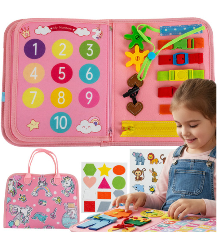 Pristatome originalią, lavinančią Montessori manipuliacinę lentą veltinio knygos pavidalu su vienaragio motyvu, sukurtą specialiai vaikams nuo 3 metų amžiaus. Šis interaktyvus žaislas skatina rankų vystymąsi, susikaupimą ir kūrybiškumą, įtraukia visus vaiko pojūčius. Dėl kompaktiškų matmenų (sulankstyto plotis – 22,5 cm, o aukštis – 28 cm) jį lengva nešiotis, todėl jis idealiai tinka žaisti namuose ar kelyje.