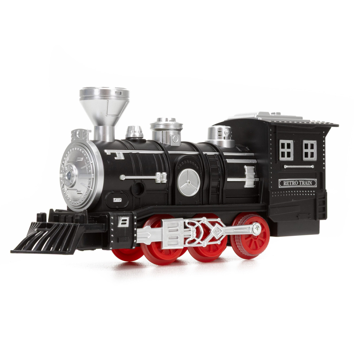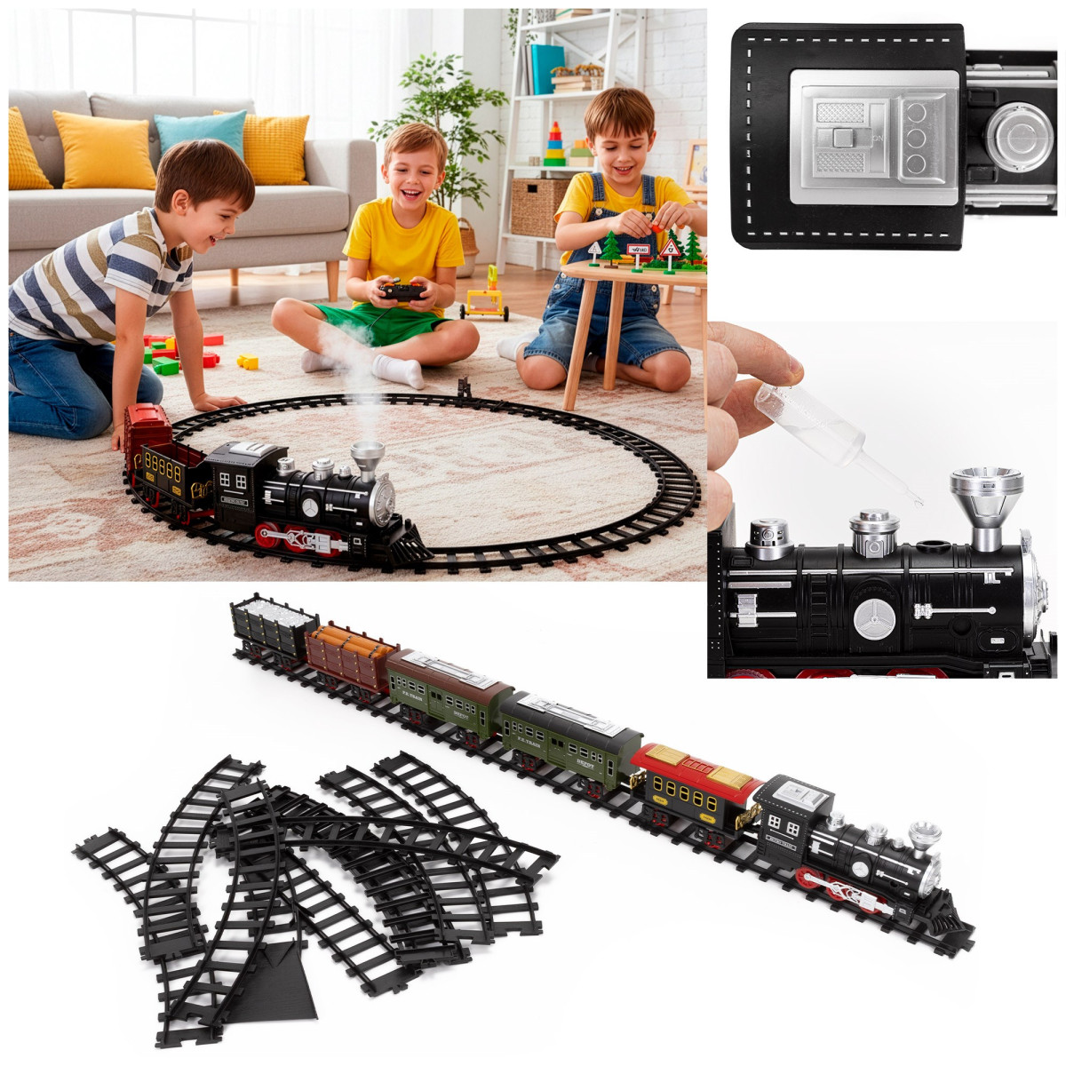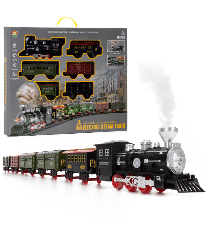 - Komplektacija: lokomotyvas, vagonai, bėgiai, pultas ir pipetė