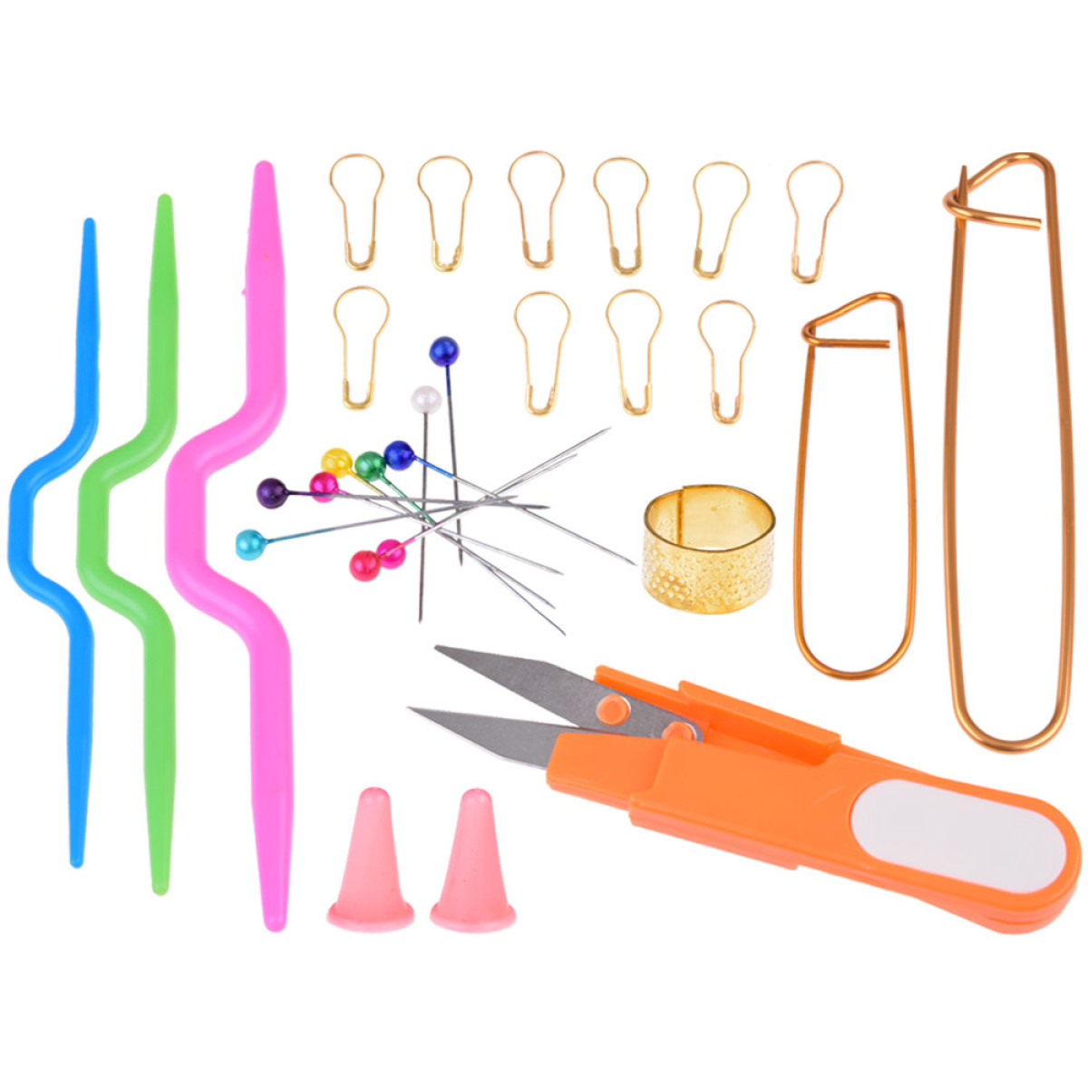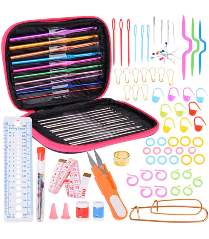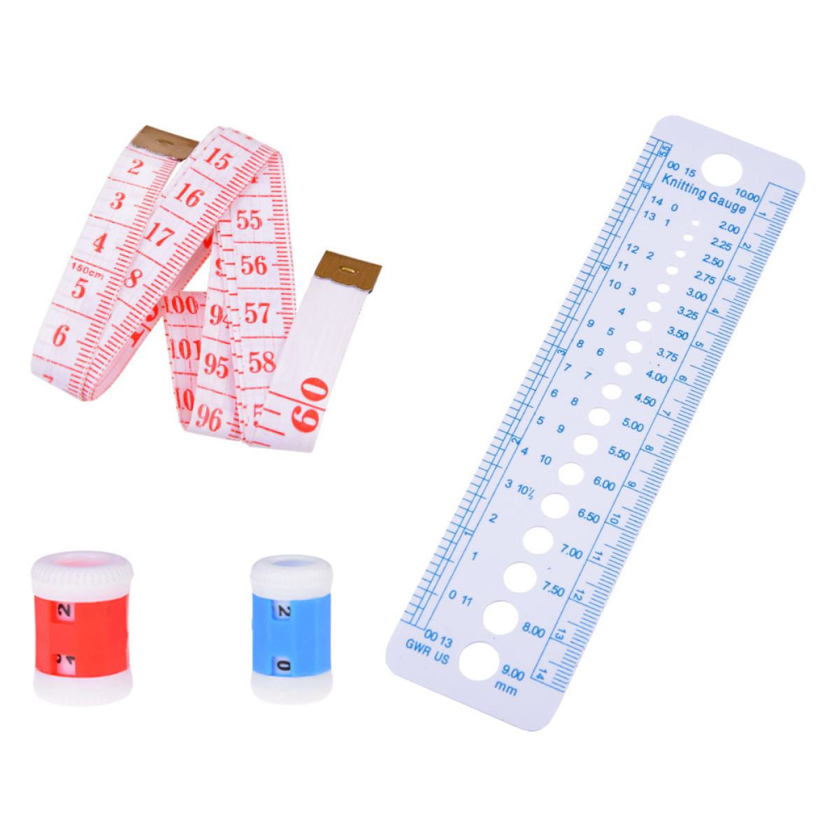 2. Papildomi elementai. Be nėrimo, rinkinyje rasite kitų priedų, kurie bus naudingi planuojant ir atliekant projektą. Rinkinyje yra: siuvimo metras, saugios žirklės, mezgimo pavyzdys, segtukai, adatos, skaitikliai ir daug kitų, todėl galėsite lengvai atlikti profesionalius nėrimo darbus.