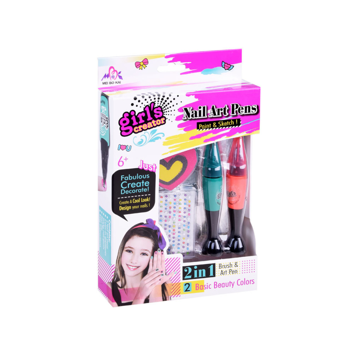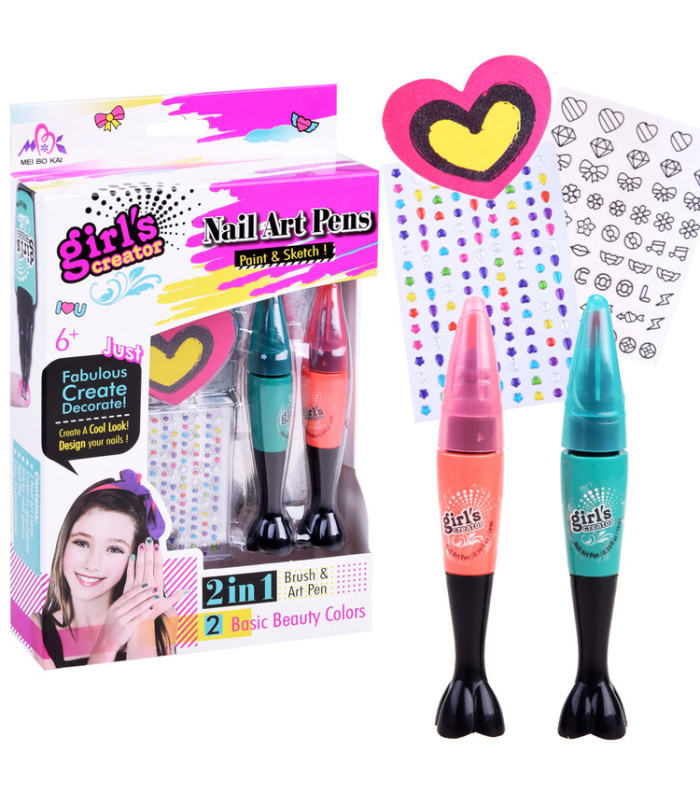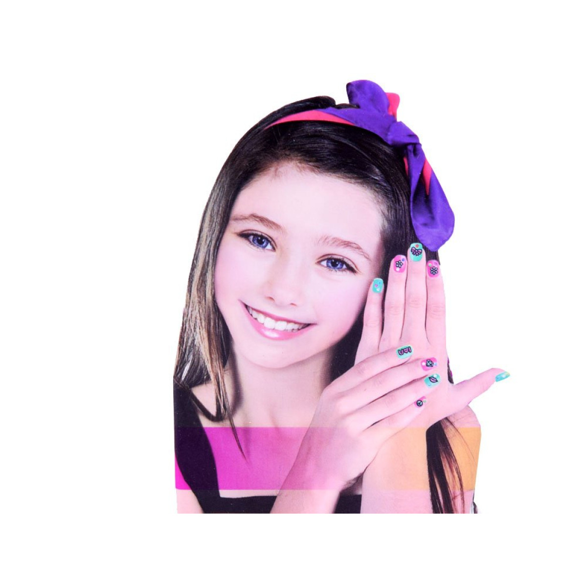 Nagų puošimo rinkinys mergaitėms. Rinkinį sudaro du lakai su dekoravimo antgaliais, spalvingi lipdukai įvairių formų, juodi raštai piešimui ir širdies formos dildė.