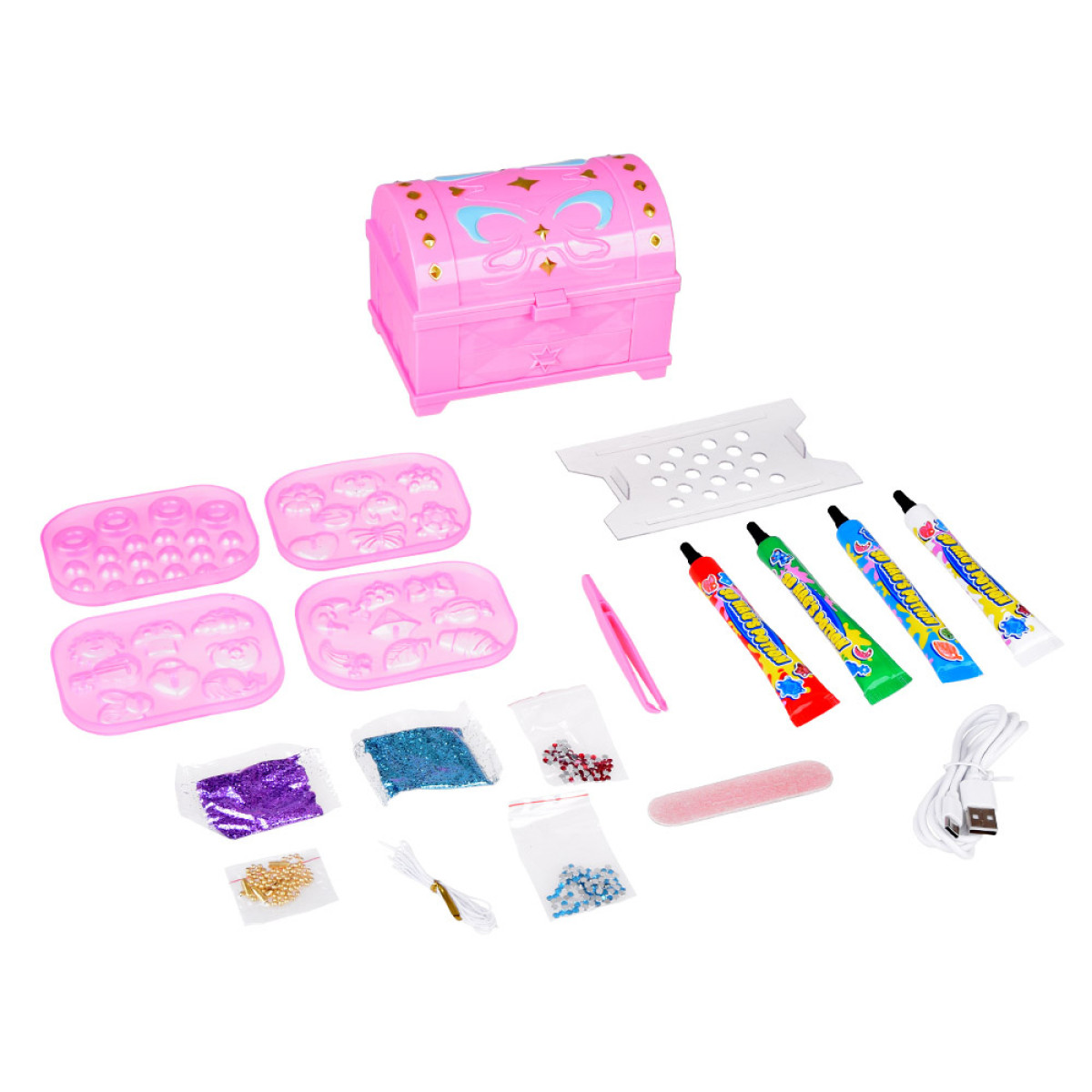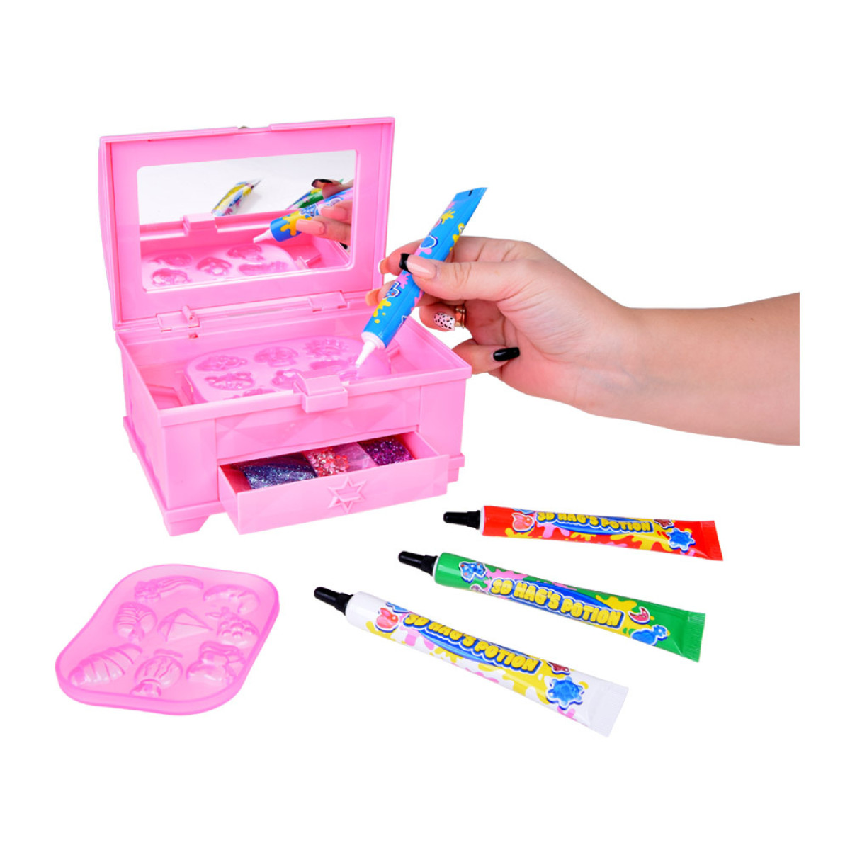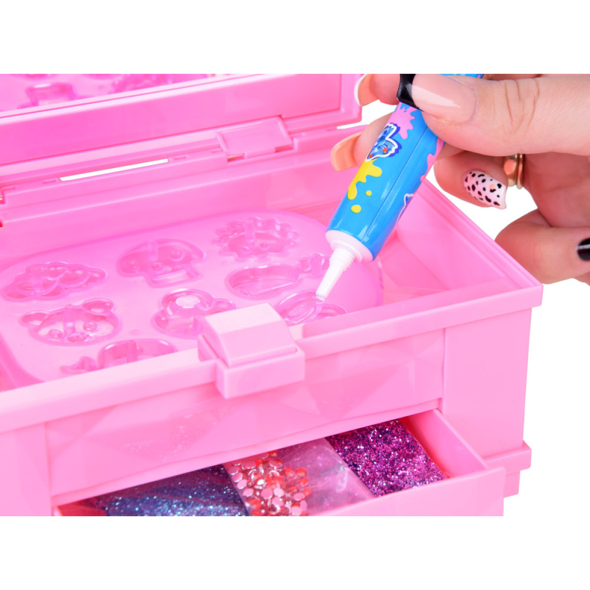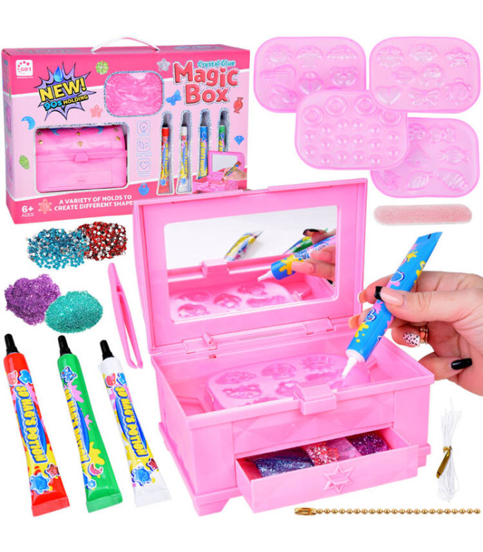 Šis karoliukų rinkinys leis kiekvienai mergaitei savarankiškai sukurti unikalią apyrankę ar žiedą, suteikiant daug teigiamos veiklos. Mergaitės, mėgstančios rankdarbius, ras daugybę įkvėpimo kurti savo papuošalus. Kiekvienas savarankiškai pagamintas papuošalas bus unikalus. Rinkinys apima rožinį plastikinį dėklą su veidrodžiu, stalčiuku ir magiška šviesa, kuri padės karoliukams greitai išdžiūti. Dėklas puikiai tiks mažosios dizainerės kambaryje.
