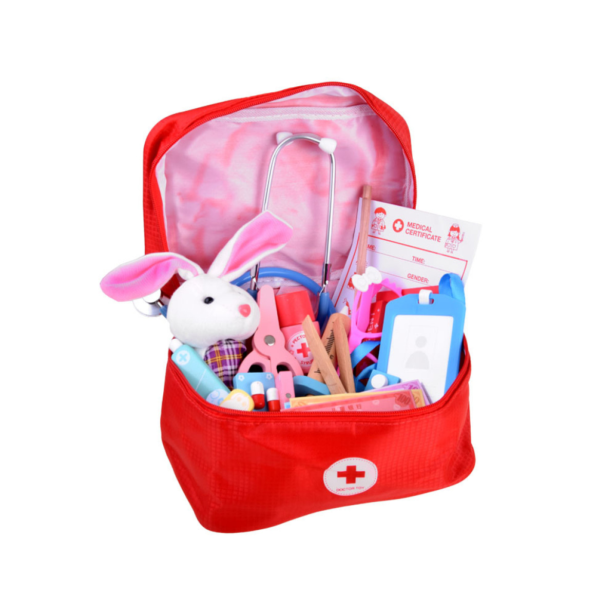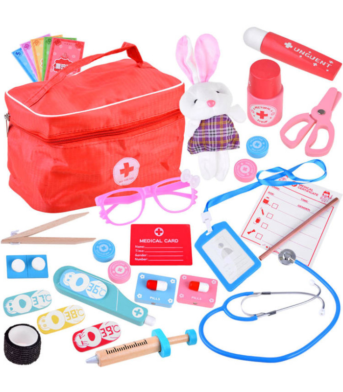 Įvairialypis mažojo gydytojo arba gelbėtojo rinkinys su mediniais priedais turi visus reikalingus įrankius smagiam žaidimui. Puikiai įrengtas, jis bus naudingas bet kokioje skubioje medicininėje situacijoje. Tai suteiks daug džiaugsmo ir linksmybių bendrame žaidime. Spalvingi medicinos priedai pagaminti iš medžio, gydytojo identifikatorius yra plastikinis, o rinkinyje esantis stetoskopas pagamintas iš metalo ir gumos. Žaislinis stetoskopas veikia panašiai kaip tikras prietaisas, klausantis galima išgirsti savo ar tiriamojo širdies plakimą. Rinkinyje yra mielas pliušinis triušiukas drąsiam pacientui. Visa tai supakuota į raudoną, patogią vaistinėlę su rankena.