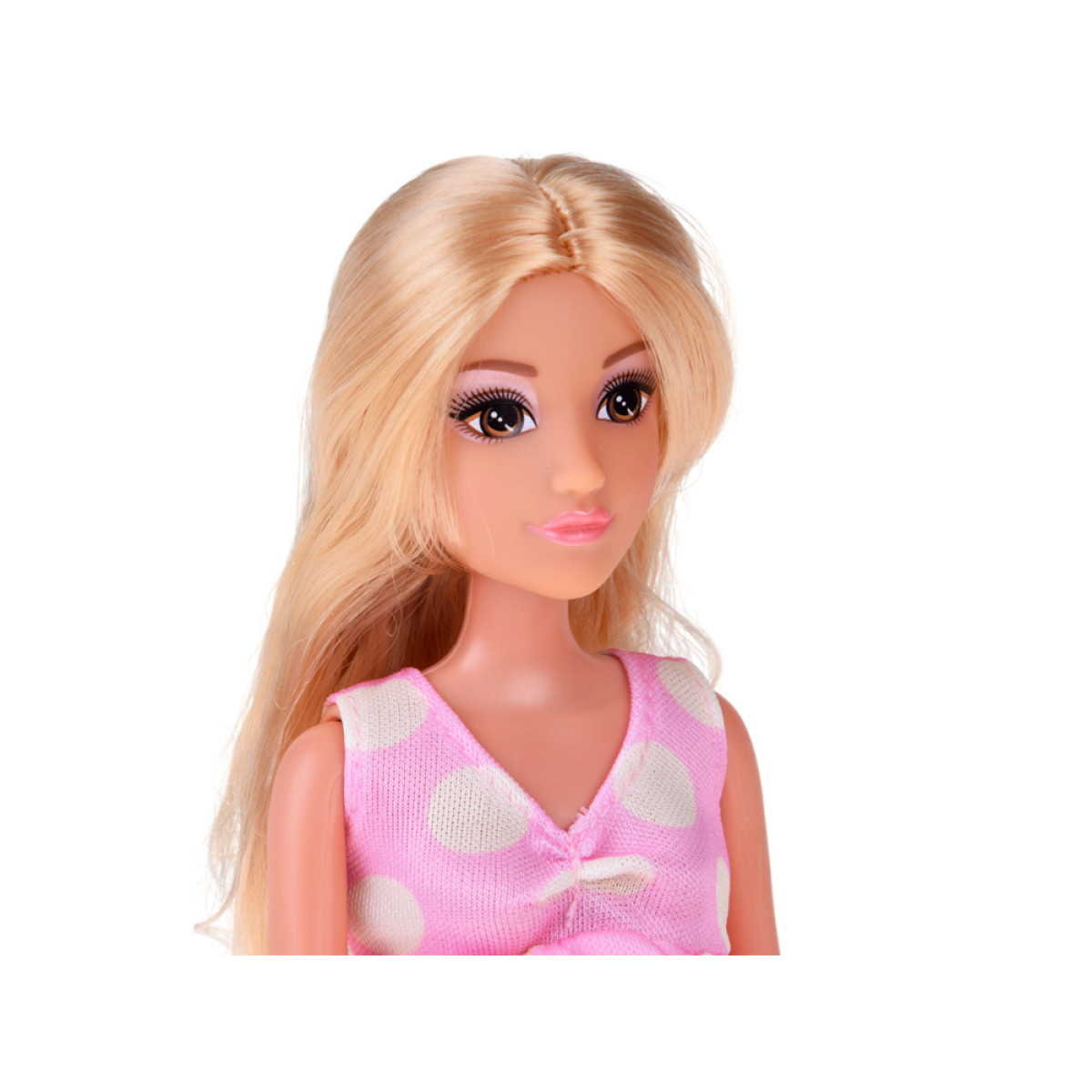 Lėlė Motina turi ilgus, šviesius plaukus, puikiai tinkančius šukuosenoms. Švelnus makiažas pabrėžia rudus akis. Ji apsirengusi laisva nėščiosios rožine suknute su taškeliais ir geltonais sportiniais batais.
