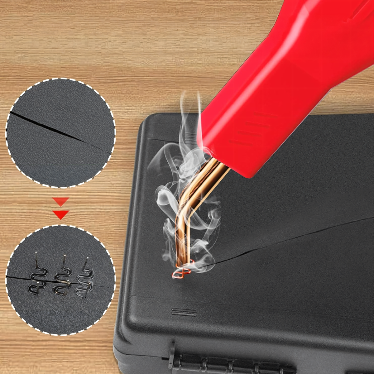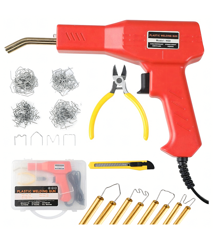 Praktiškas plastiko suvirinimo rinkinys, skirtas plastiko dalių taisymui, sutvirtinimui ir sujungimui. Rinkinyje yra kabių suvirintuvas, zgrandinimo ir litavimo funkciją atliekantis įrankis, kabės ir replės. Tai patogus sprendimas tiek profesionaliam naudojimui, tiek kasdieniams remonto darbams.