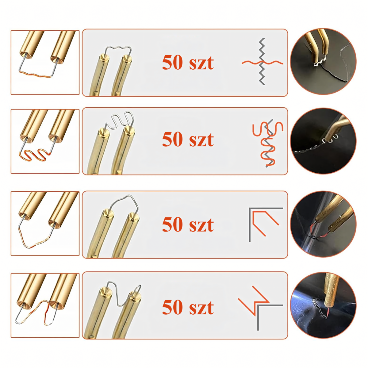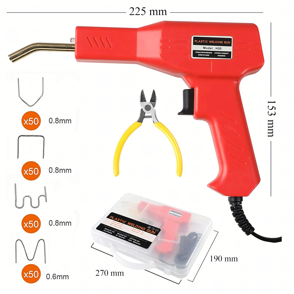Komplektą sudaro: plastiko suvirinimo įrankis, kabės, replės ir plastikinė dėžutė.